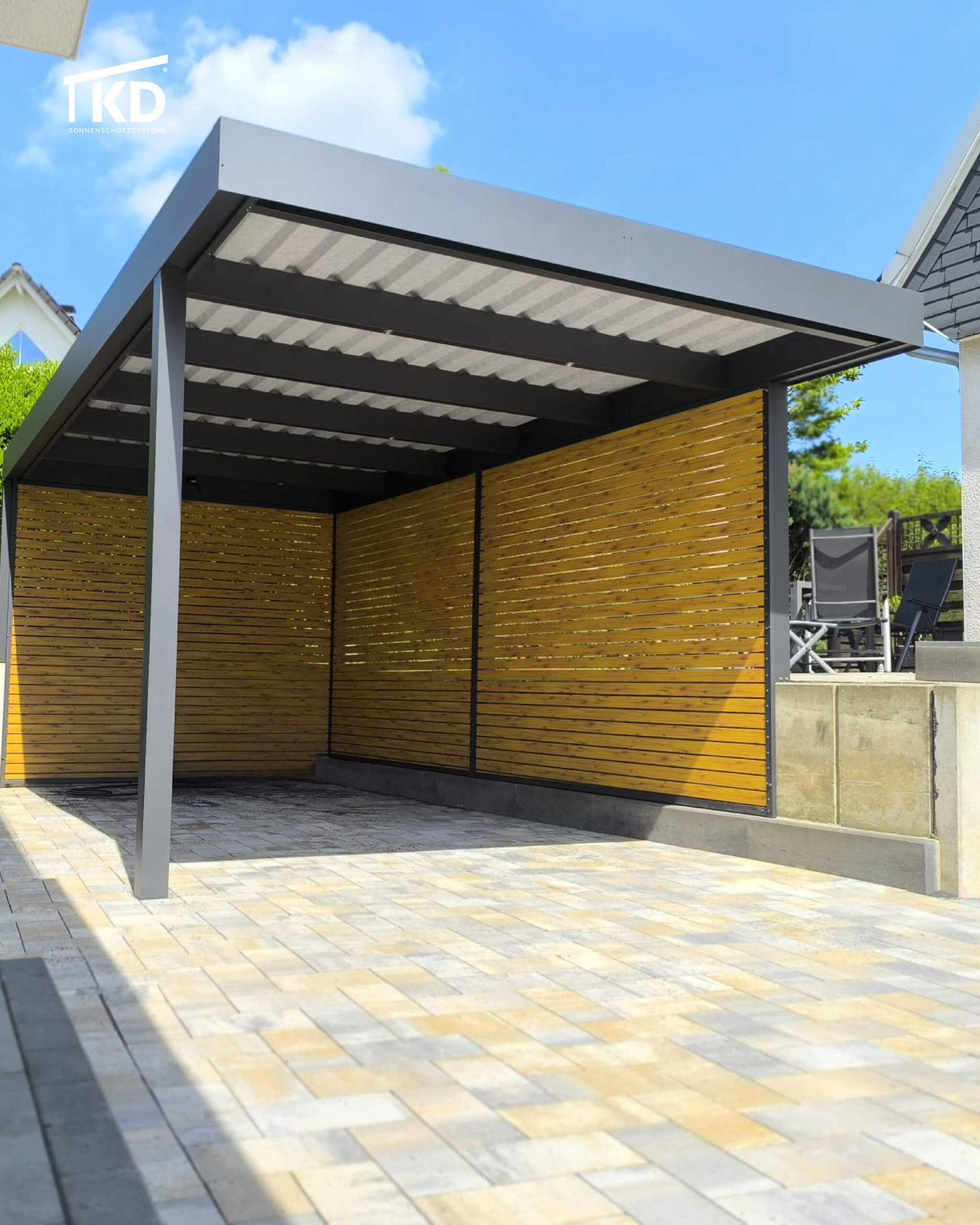 Mit der optionalen HPL-Verkleidung für das KD Carport Cube schaffen Sie eine moderne und ästhetische Optik von unten. Diese Verkleidung verdeckt die Eindeckung und verleiht Ihrem Carport ein elegantes, glattes Erscheinungsbild. Ideal für diejenigen, die Wert auf ein minimalistisches Design und eine hochwertige Ästhetik legen. Robust und pflegeleicht, sorgt die HPL-Verkleidung nicht nur für einen optischen Mehrwert, sondern auch für eine langlebige, widerstandsfähige Lösung.
